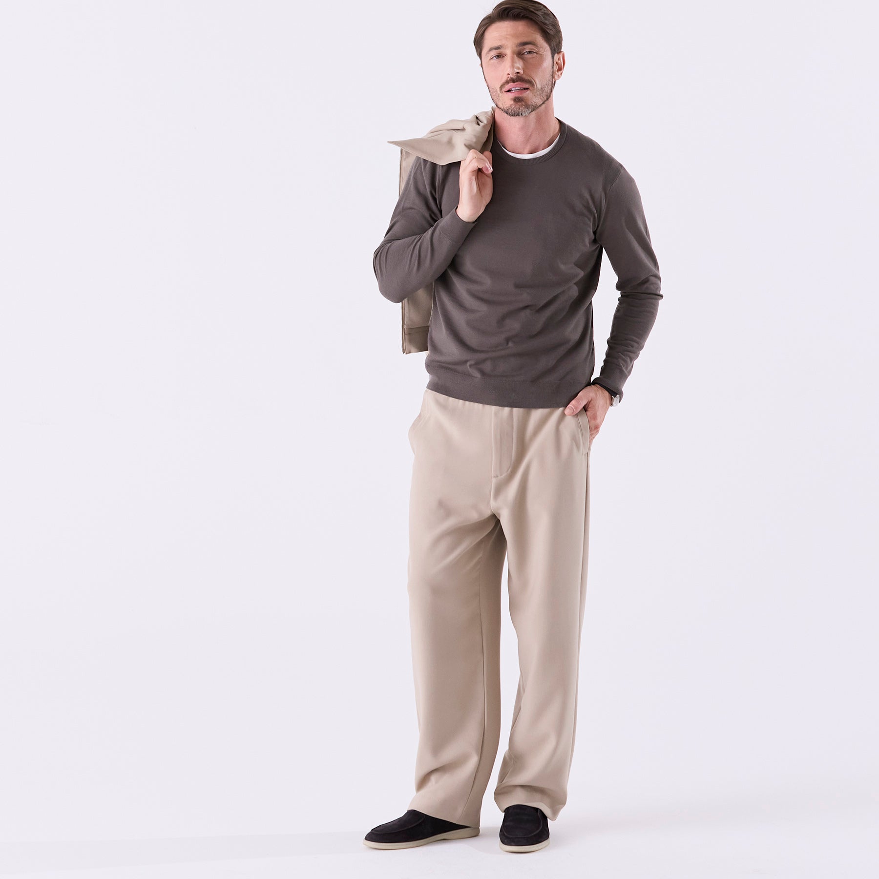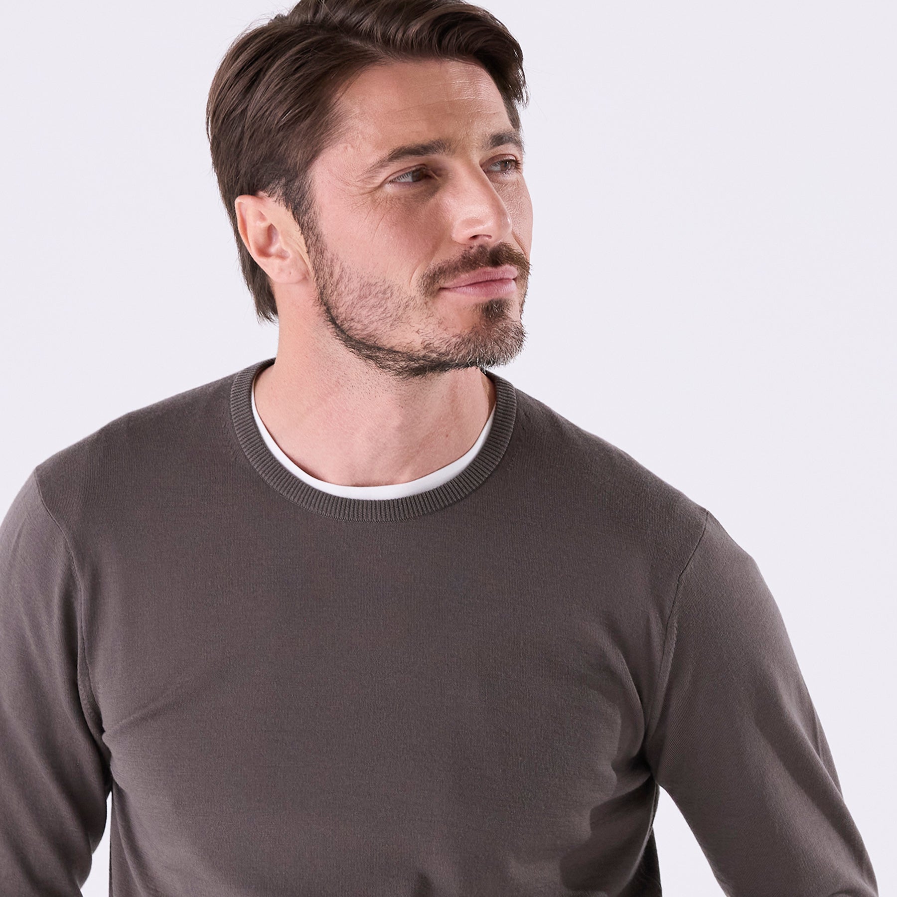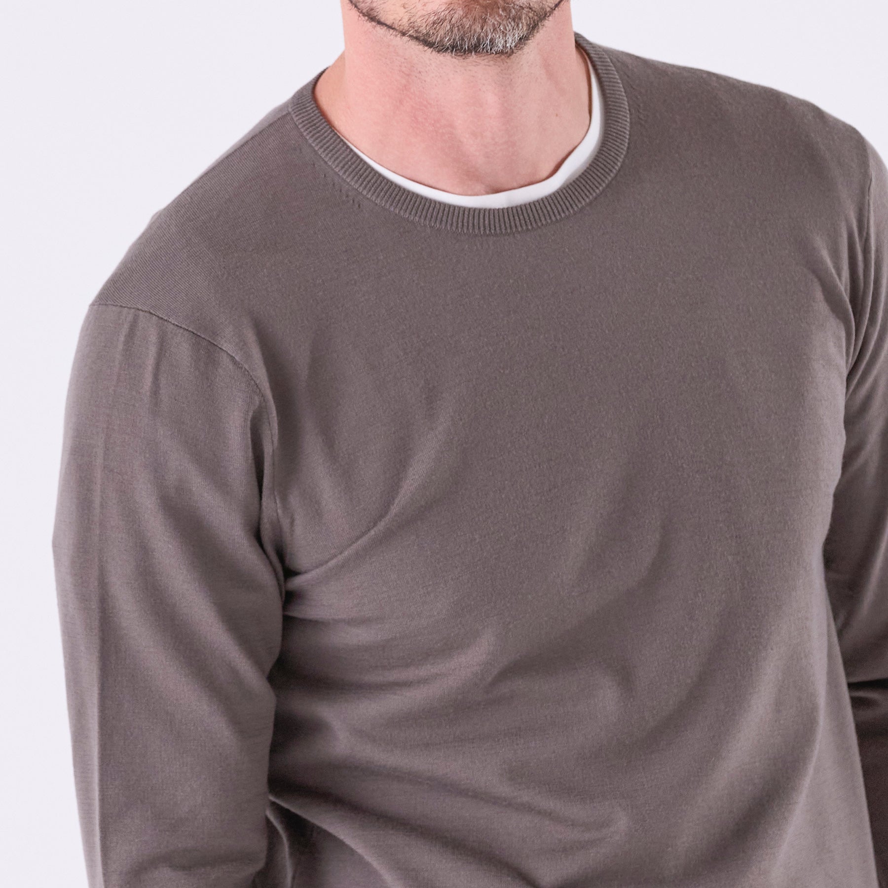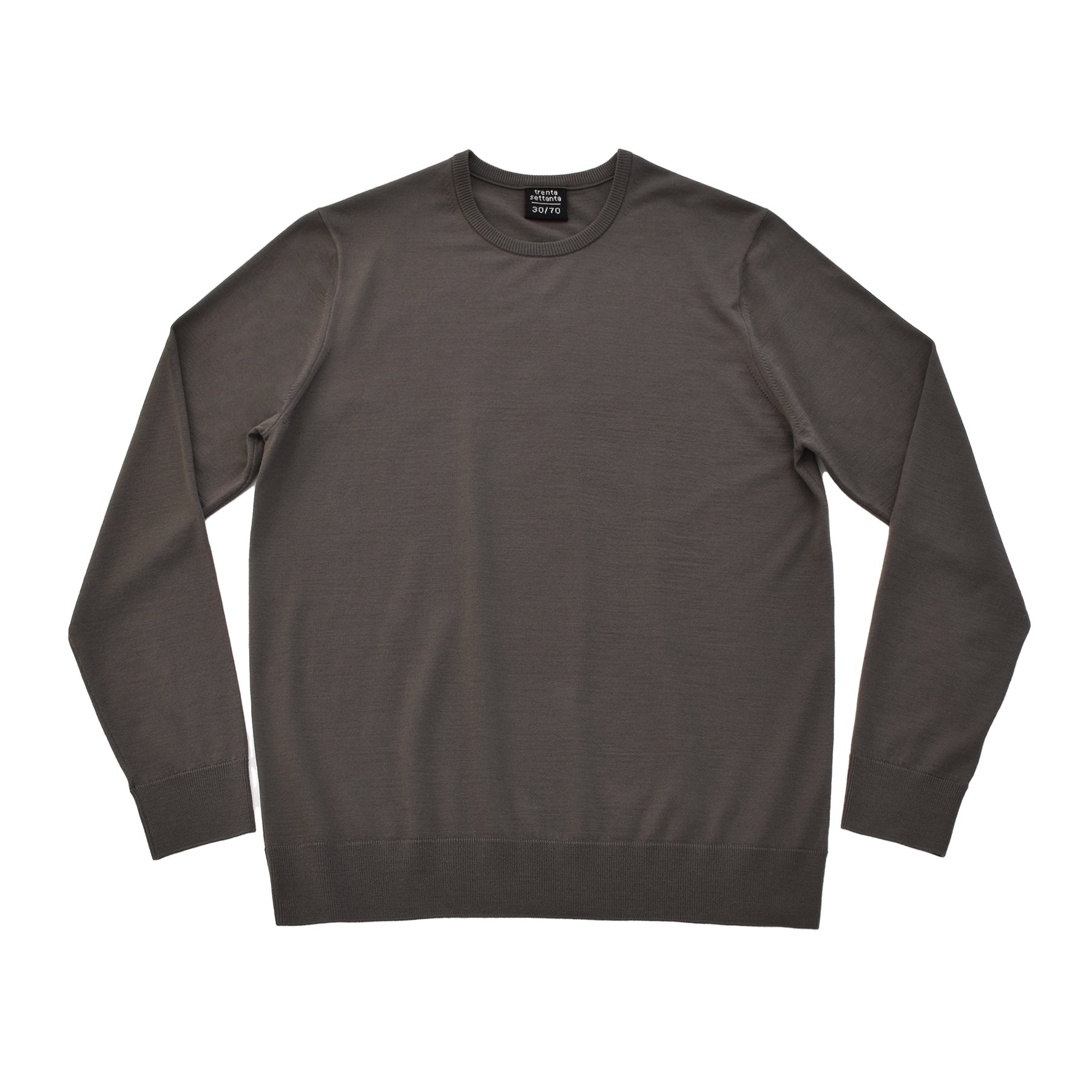 f-quattroは、非常に品質の高いスーパーエクストラファインメリノウールを使用。繊維の細さはベビーカシミヤにも匹敵する14.5µ(=super180's)。繊維長が長く伸縮性に優れ、シルクのような滑らかさとしなやかさを感じられる素材です。これを美しい天竺目を作り出すクラシックマシーンで編み上げ、着心地がよく見た目も美しいニットに仕上げました。素材そのものの質の高さと希少なマシーン、緻密な人の手仕事から生まれる究極のベーシックニットをご体感ください。※原料に限りがある為、年内の追加生産はございません。
