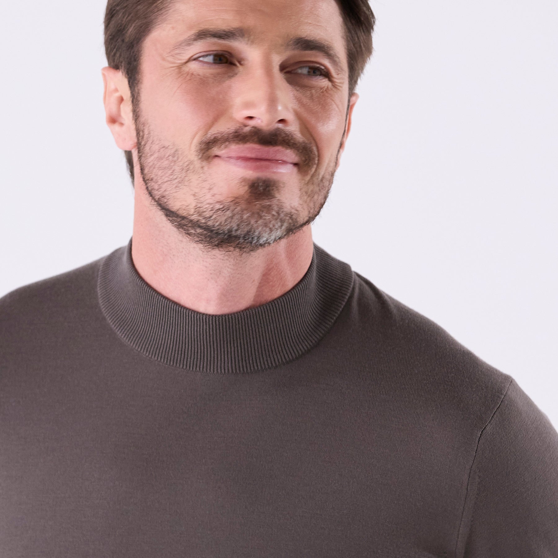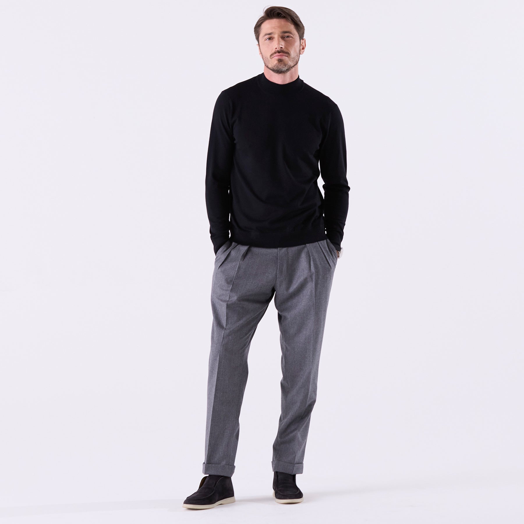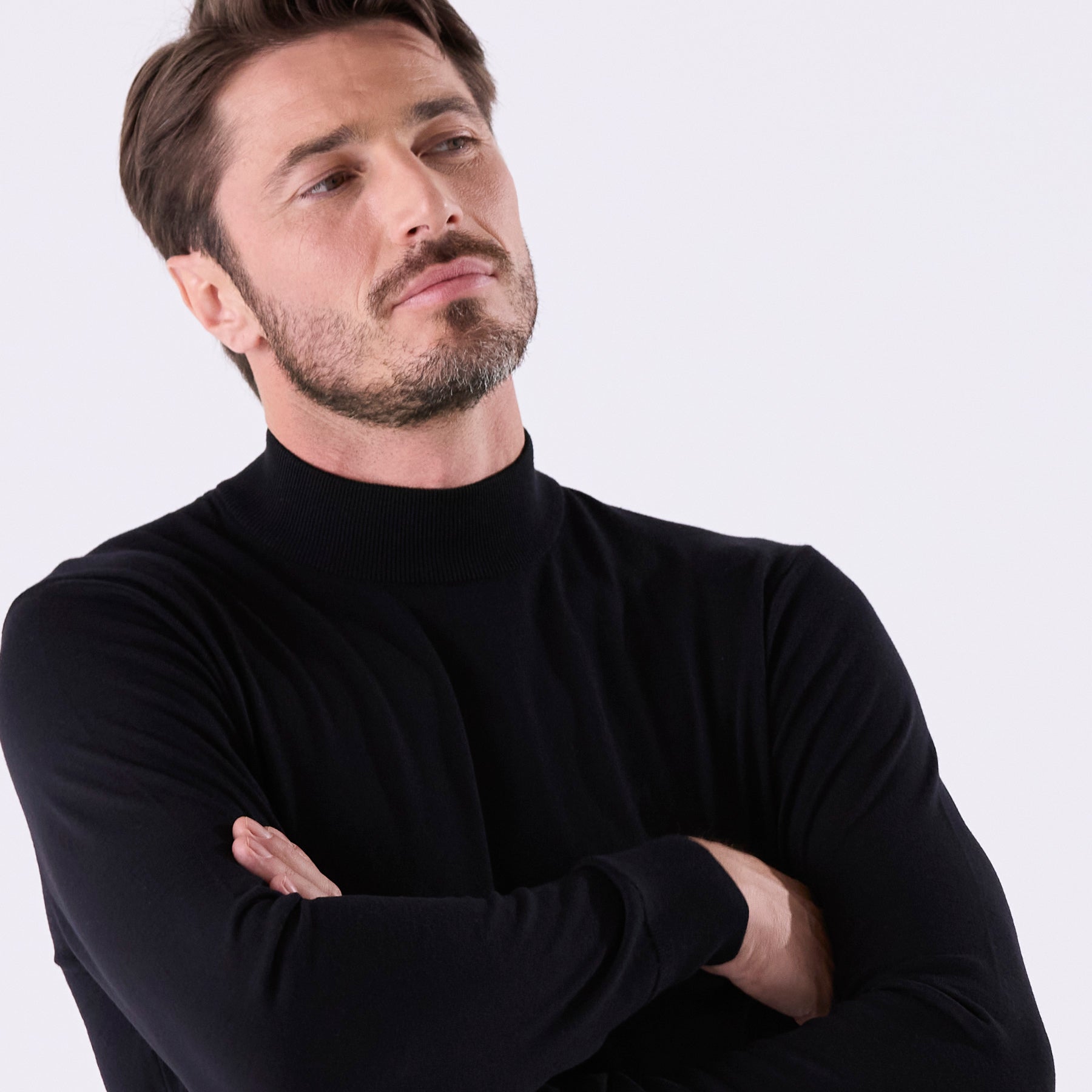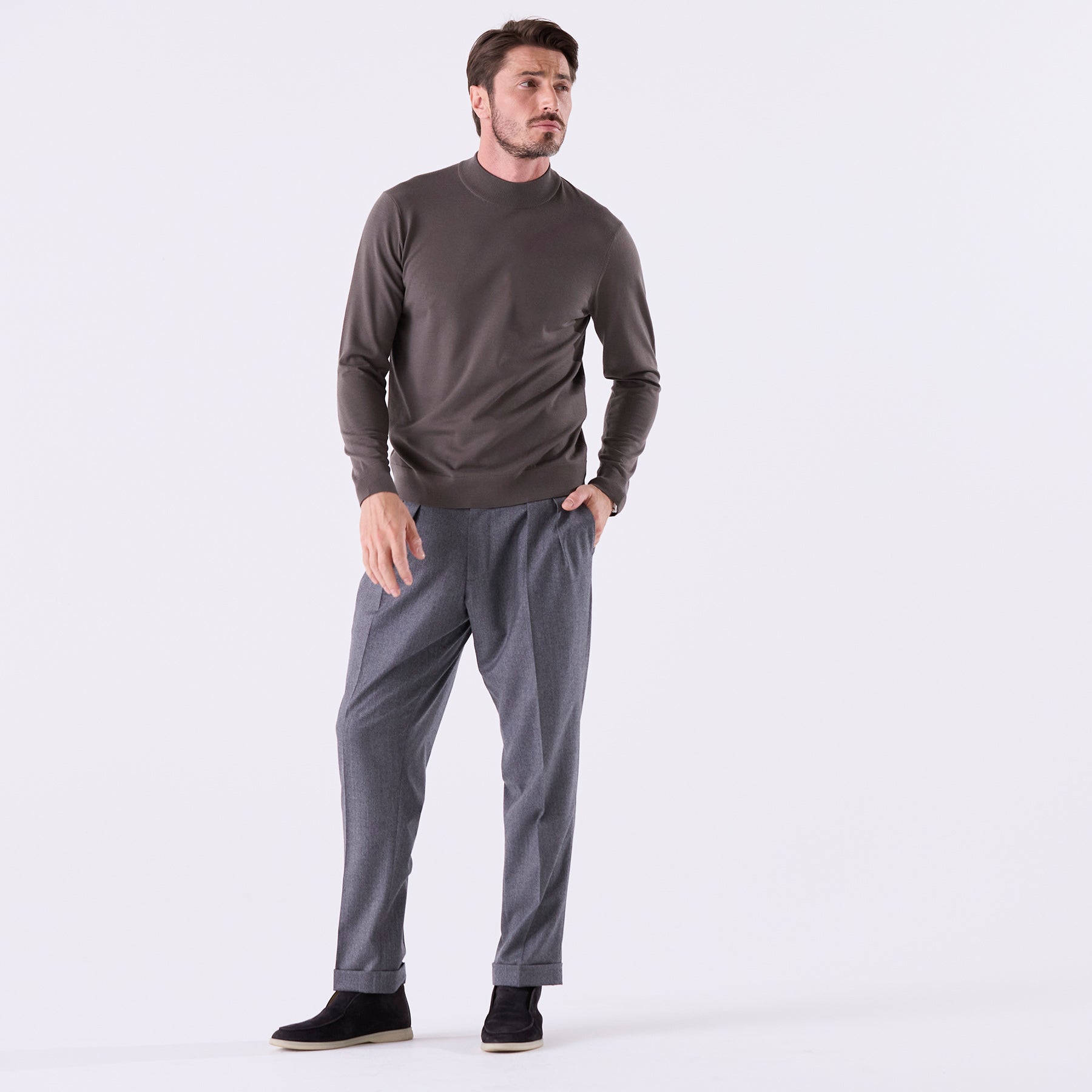 昨年販売開始から高い人気を集めたf-quattroに新型モックネックが登場。非常に品質の高いスーパーエクストラファインメリノウールを使用。繊維の細さはベビーカシミヤにも匹敵する14.5µ(=super180's)。繊維長が長く伸縮性に優れ、シルクのような滑らかさとしなやかさを感じられる素材です。これを美しい天竺目を作り出すクラシックマシーンで編み上げ、着心地がよく見た目も美しいニットに仕上げました。素材そのものの質の高さと希少なマシーン、緻密な人の手仕事から生まれる究極のベーシックニットをご体感ください。