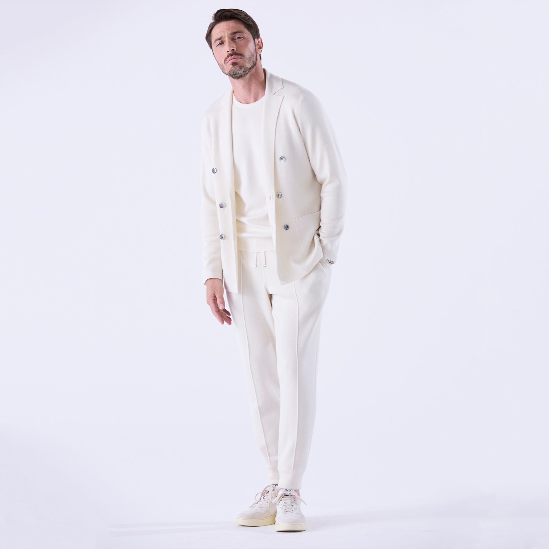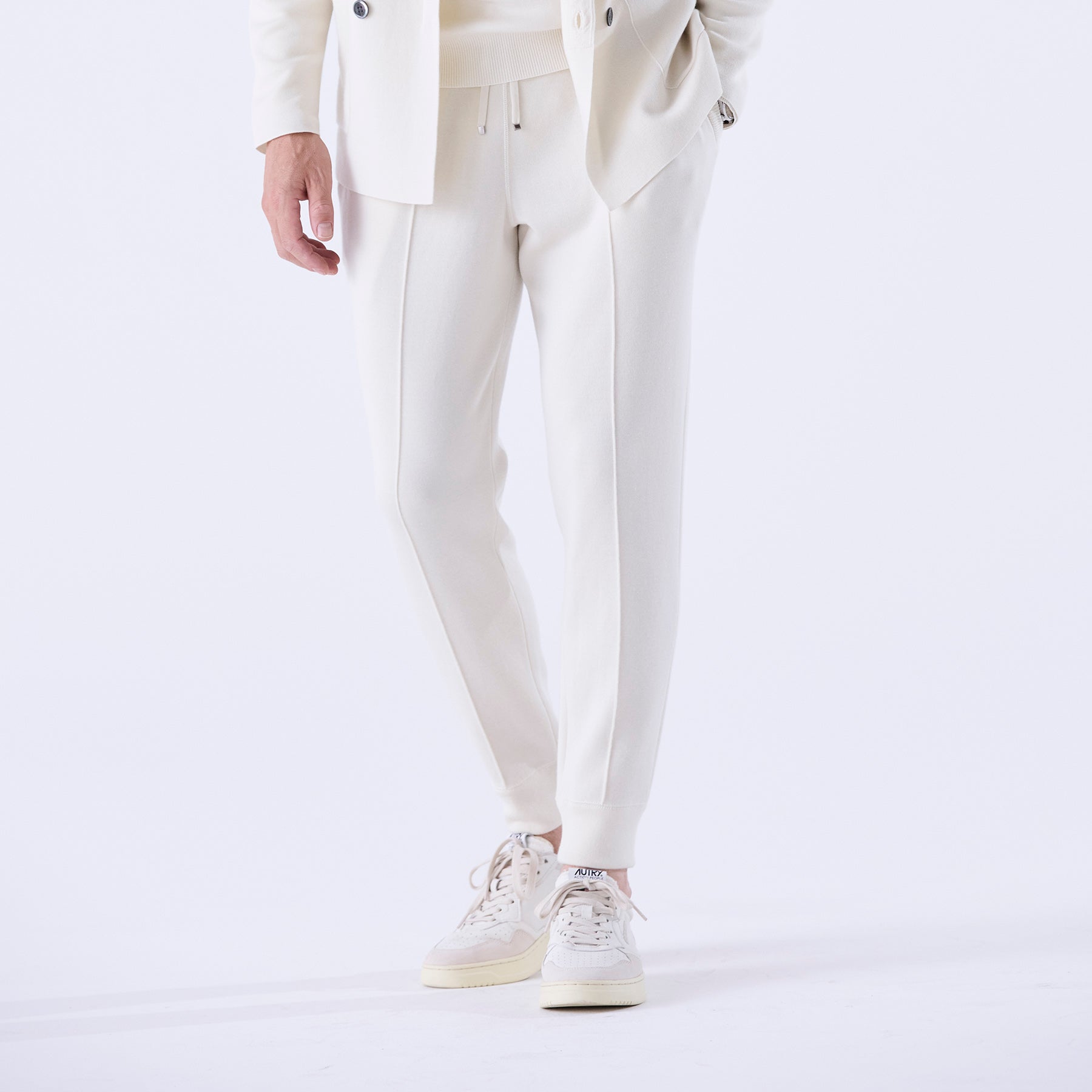 前パーツに編みでプレスラインを加える事でストレートのラインが強調され、より綺麗なシルエットに生まれ変わったニットパンツ。パンツの脇線はニットの成形技法による編み端使いで縫い代を限りなく細く・薄くおさえ、肌に触れた時のストレスがありません。また、脇ポケットの袋も編みだけで作りこんでいるので、こちらも肌に縫製部分があたらない優秀な設計。素材のラグジュアリーさだけではなく、履き心地にもとことんこだわったオフタイムの相棒とも呼ぶべきニットパンツです。