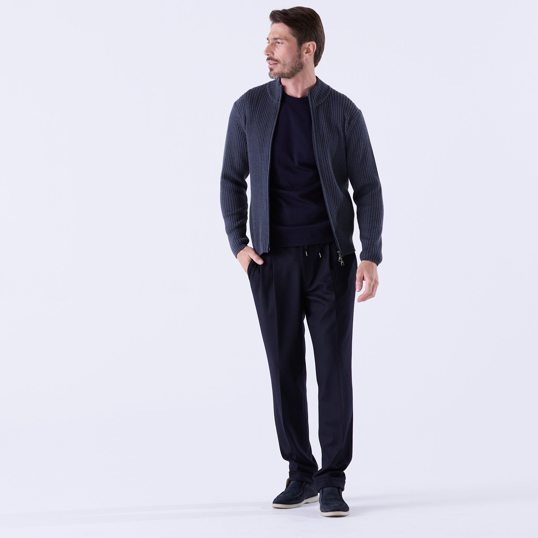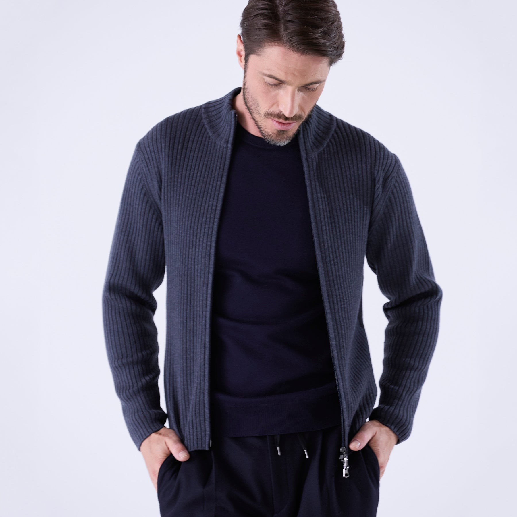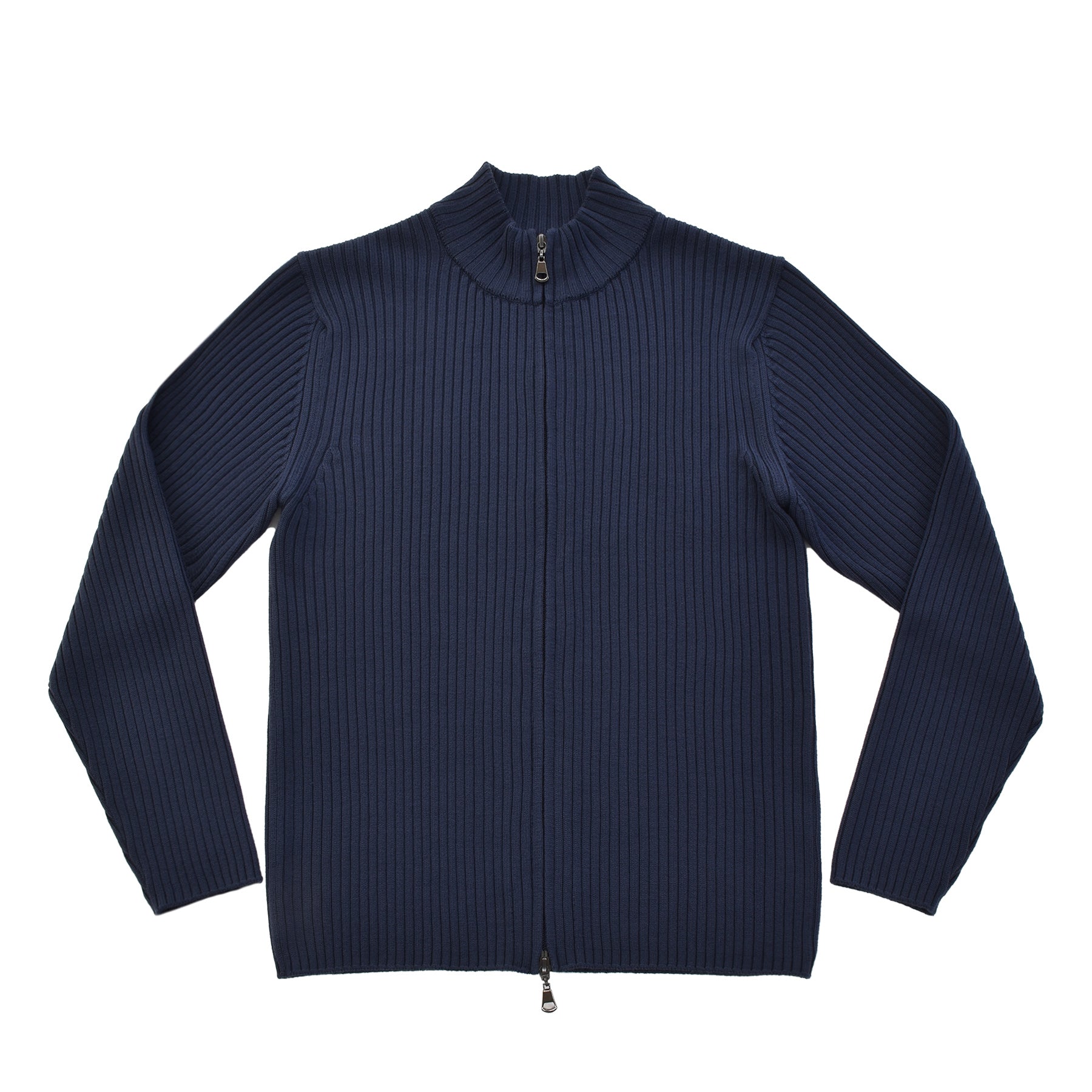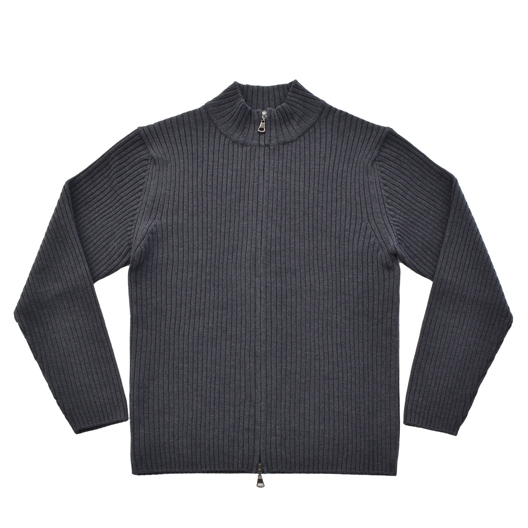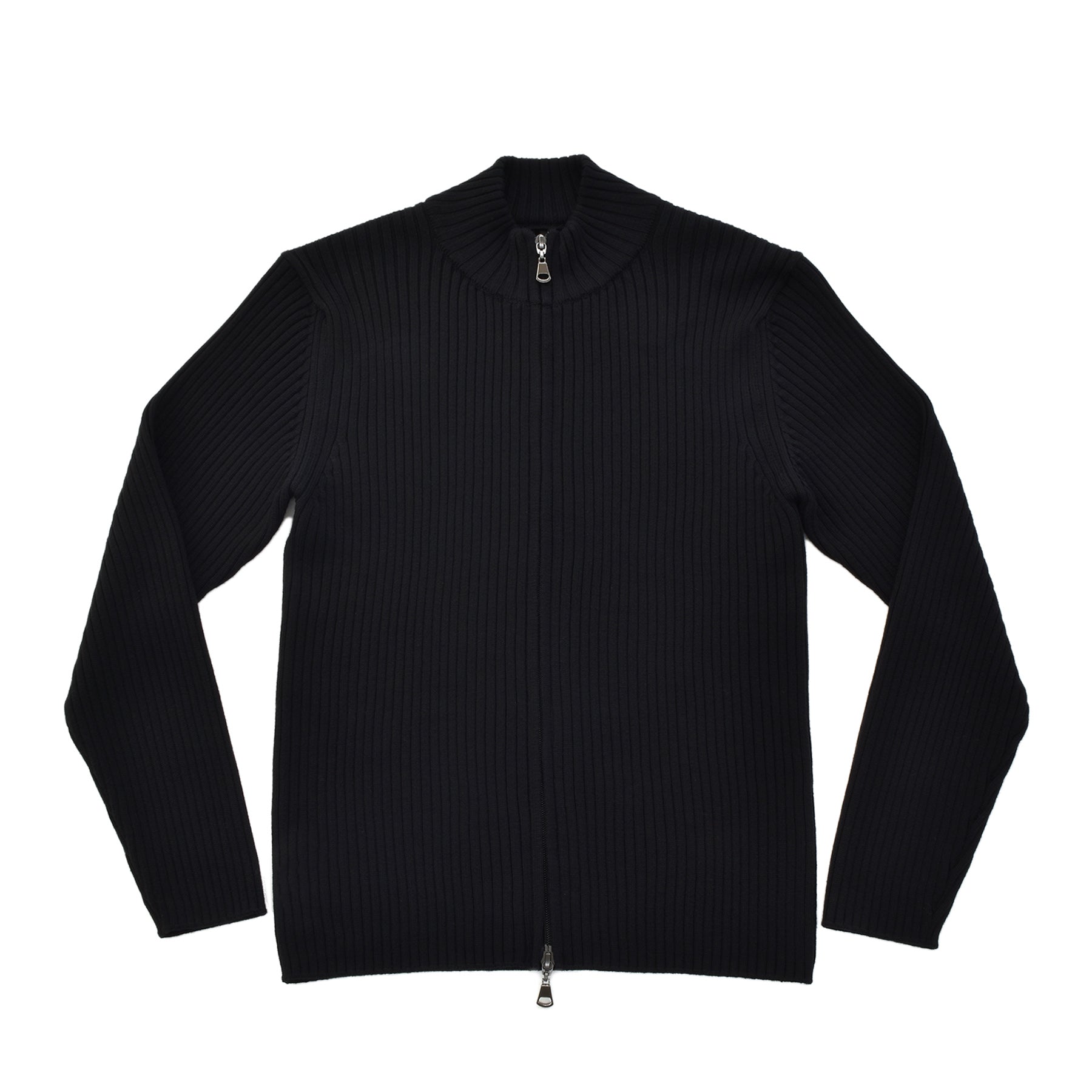 糸はカシミヤ繊維にも近しい細さのスーパーエクストラファインメリノ(スーパー140’S)を使用。しめつけ過ぎない緩めのリブが身体のラインに自然に寄り添い、縦に走る編み目の効果でシャープな印象を与えてくれます。ダブルジップ仕様なので首元の開閉だけでなく、上はしっかり締めて下は動きやすいように少し開けて着るなど、着こなしの幅も広いアイテムです。