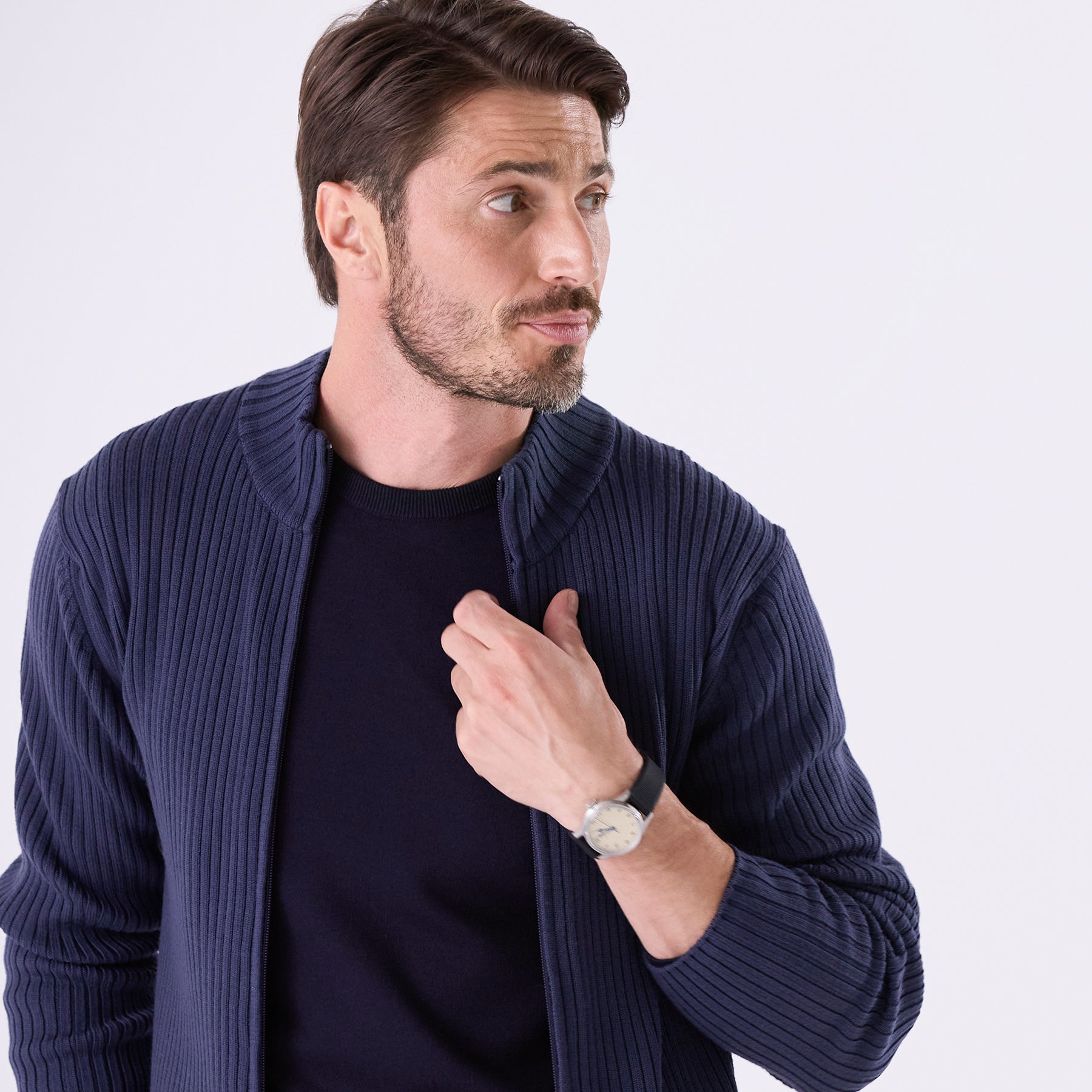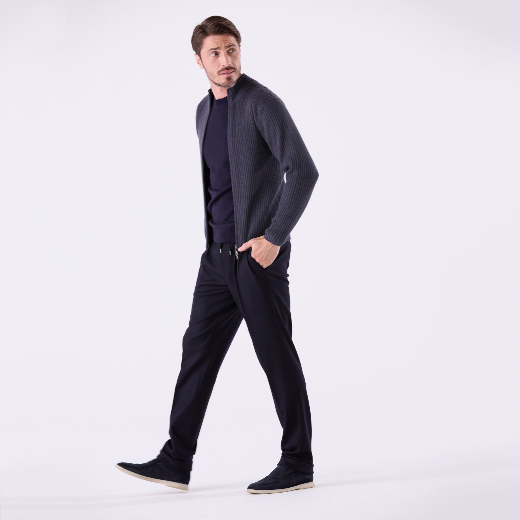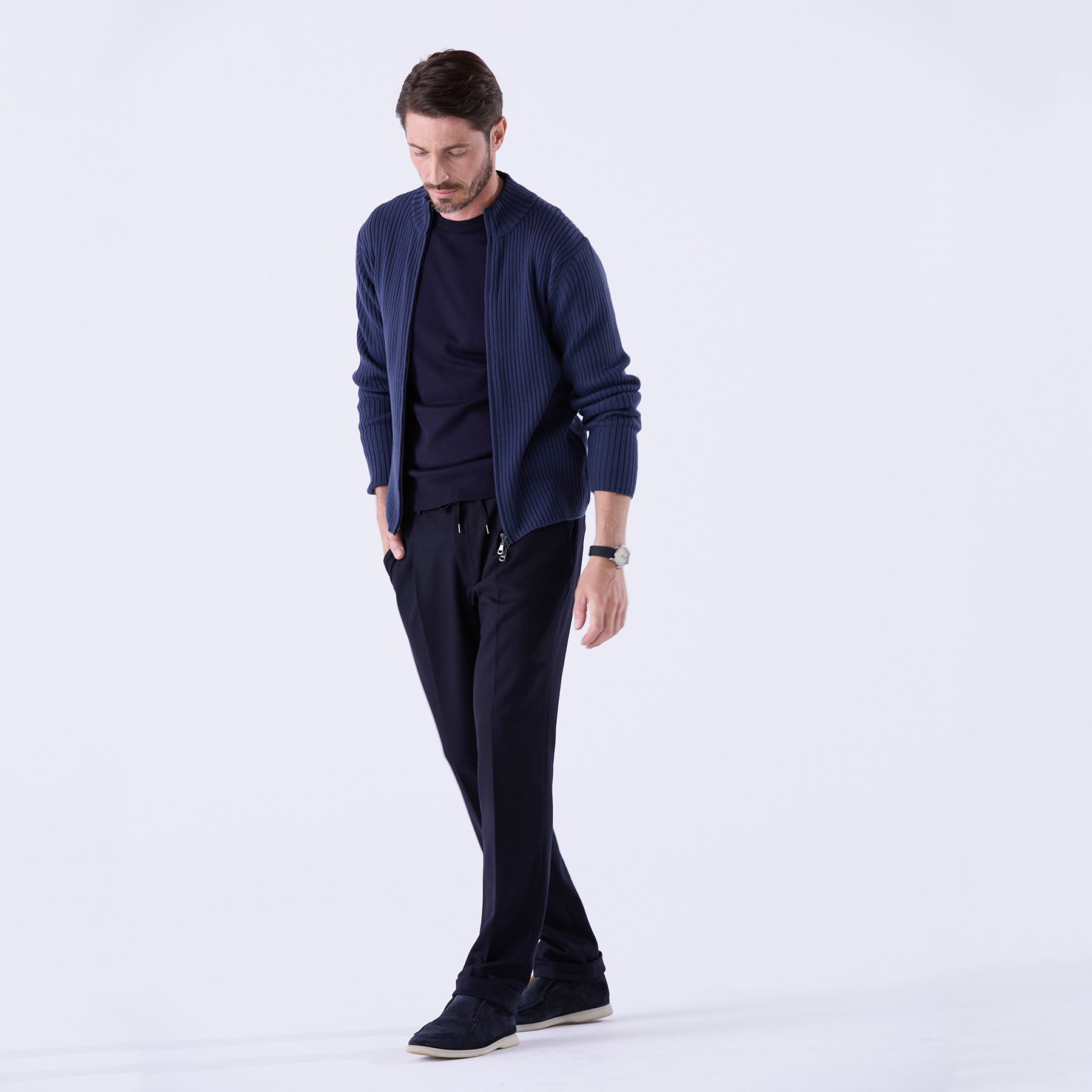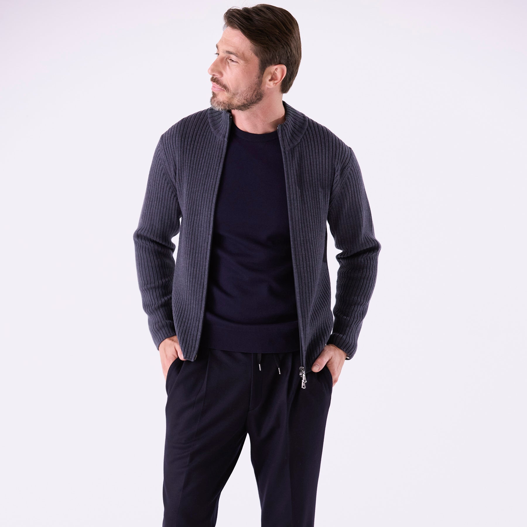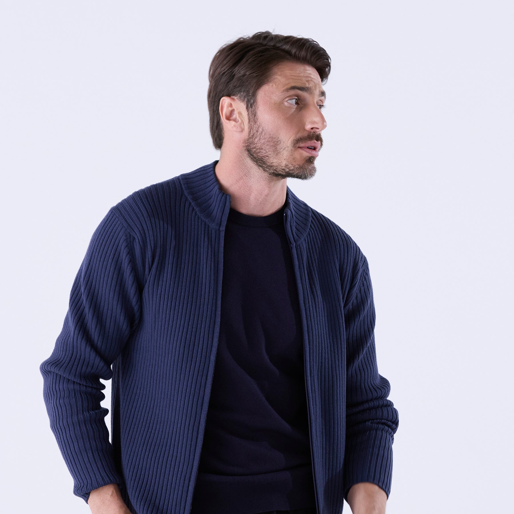 糸はカシミヤ繊維にも近しい細さのスーパーエクストラファインメリノ(スーパー140’S)を使用。しめつけ過ぎない緩めのリブが身体のラインに自然に寄り添い、縦に走る編み目の効果でシャープな印象を与えてくれます。ダブルジップ仕様なので首元の開閉だけでなく、上はしっかり締めて下は動きやすいように少し開けて着るなど、着こなしの幅も広いアイテムです。