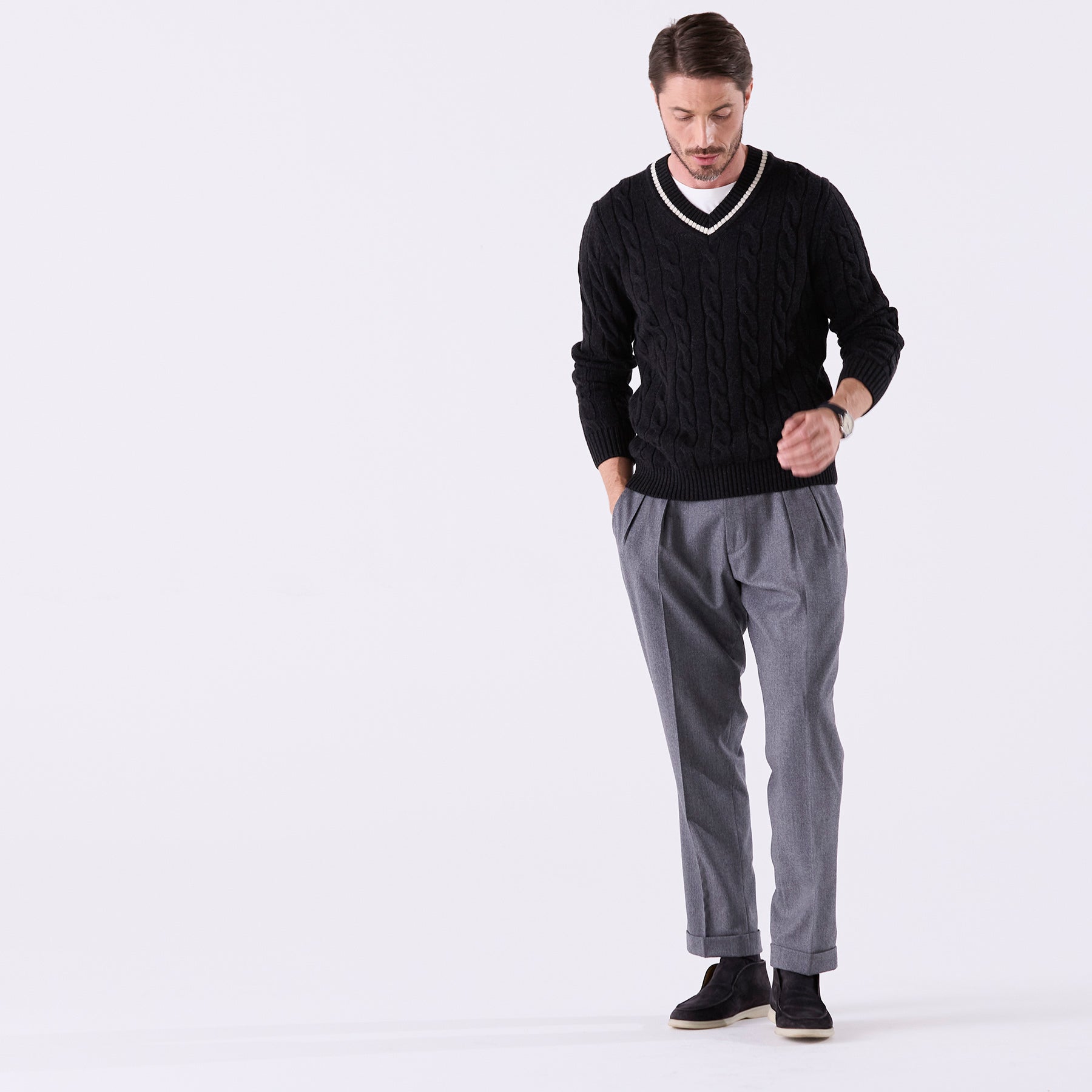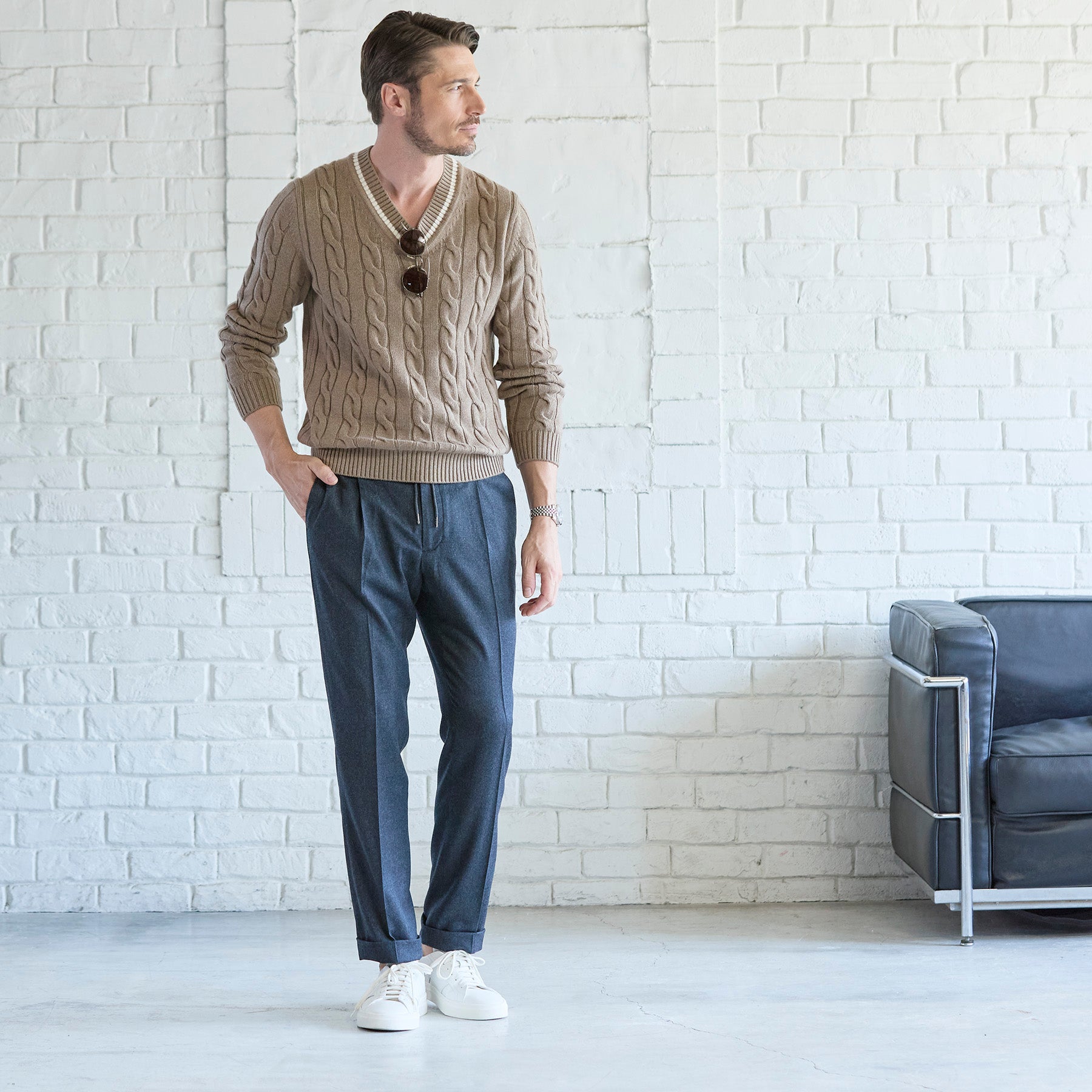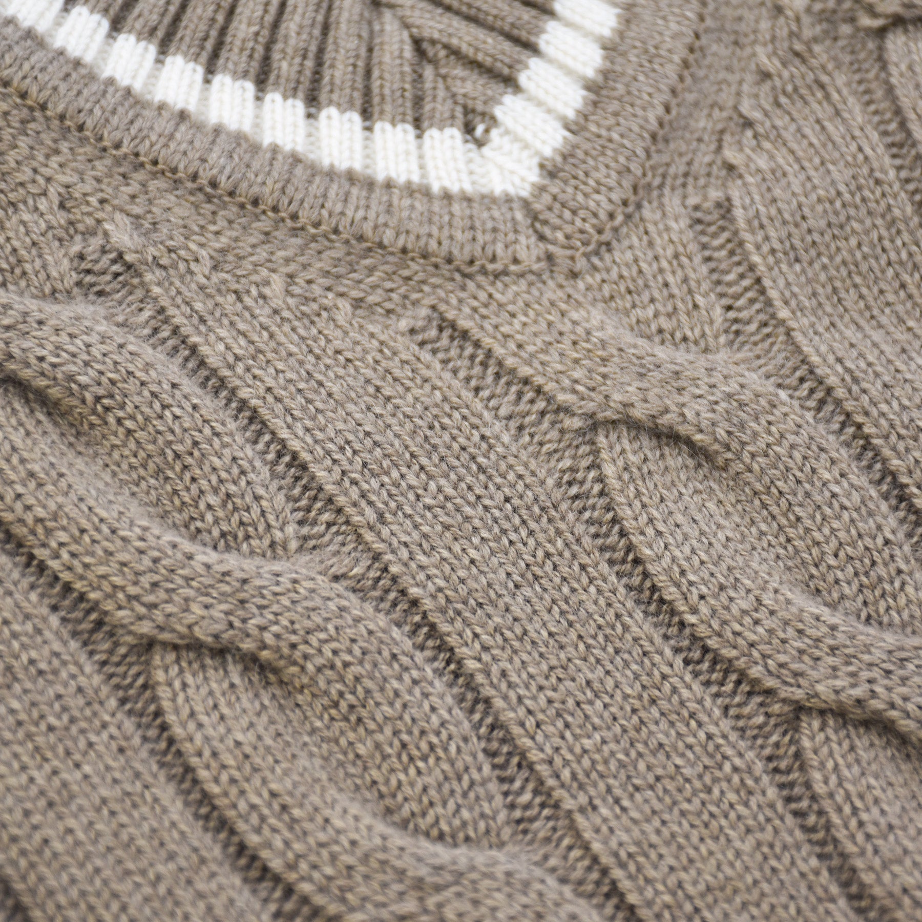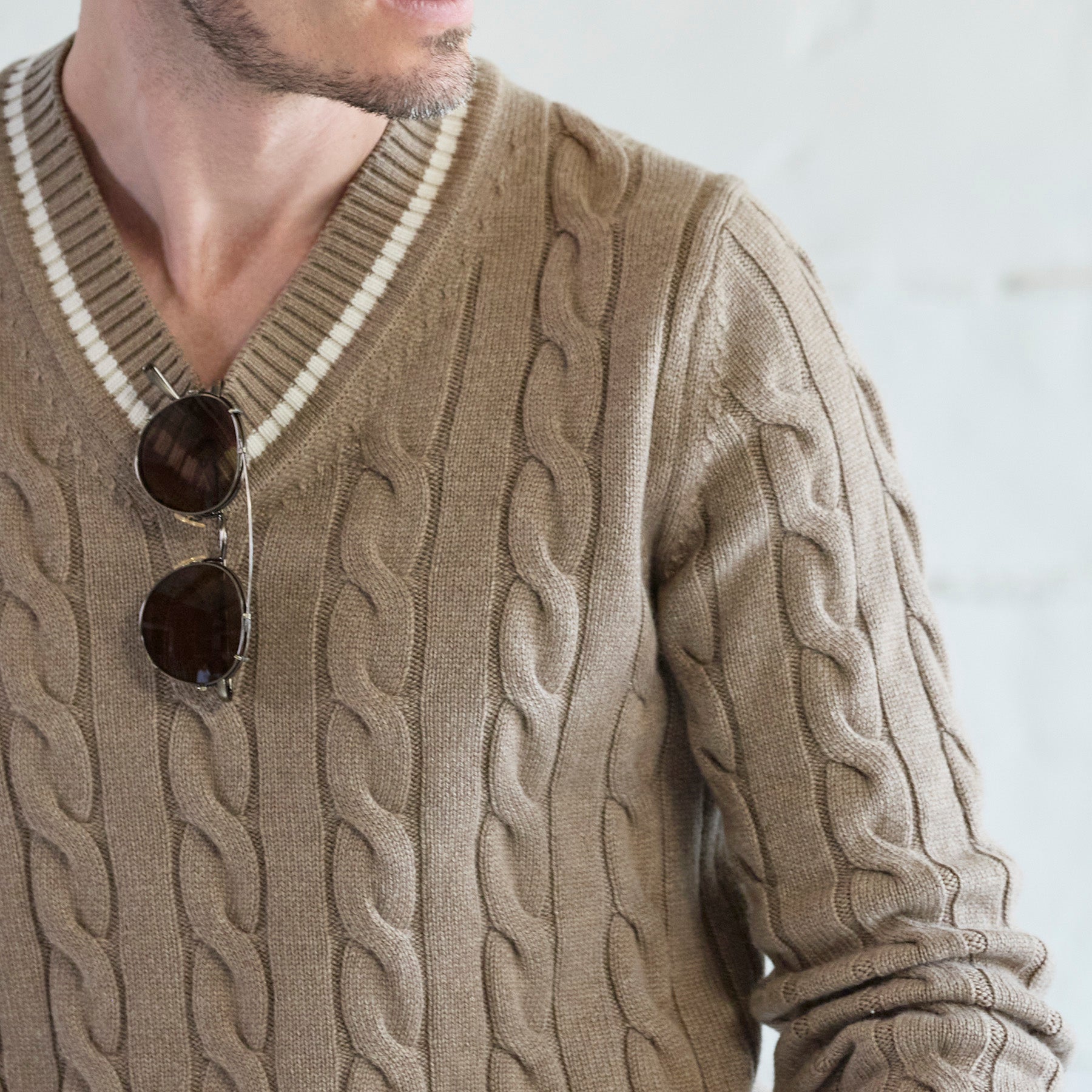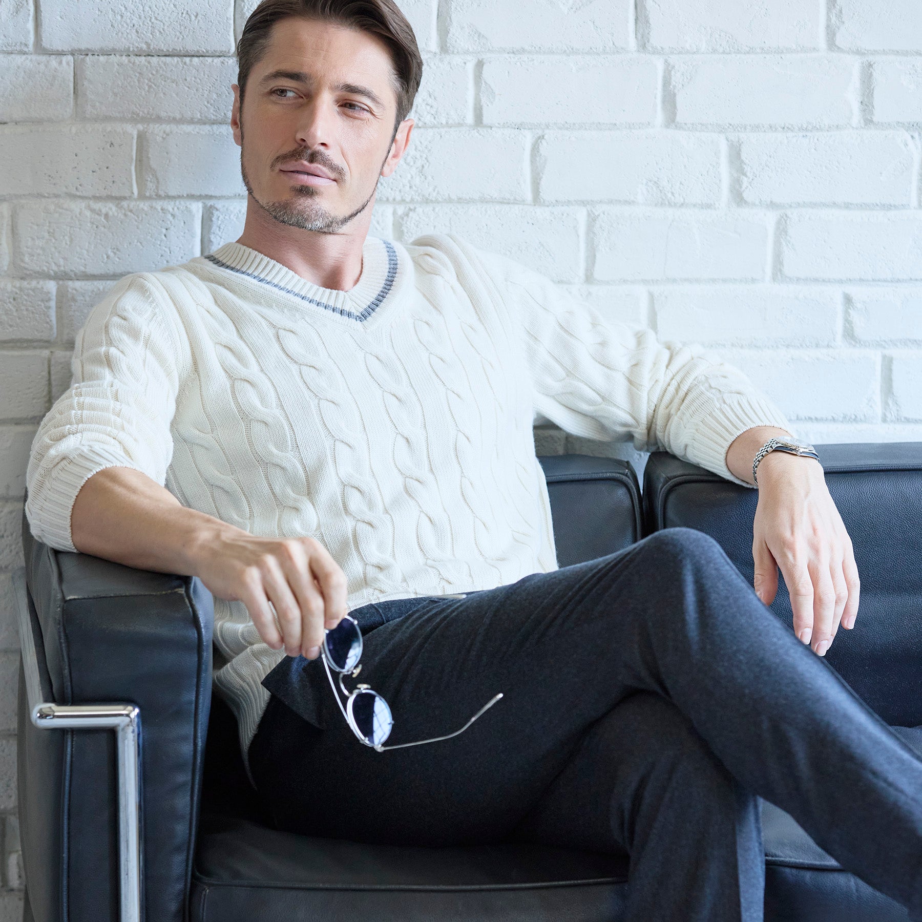 極上の着心地を生み出すカシミア70%シルク30%の糸を贅沢に使いケーブルで編み立てたラグジュアリーニット。こちらは定番のottimo・lussoシリーズの糸とは異なり、ふんわりと膨らみがある太番糸を使用しています。シルクが配合されていることで編地に適度なコシが加わるので、カシミヤ100%の柔らかさに少し抵抗があるという方にもおすすめです。丸みのある糸がケーブル柄を立体的に浮き上がらせ、アクセントに入れたネックの配色ラインが全体をシャープに引き締めてくれます。クラシックなデザインに素材の上質さが加わり、クラス感の漂う1枚に仕上がっています。