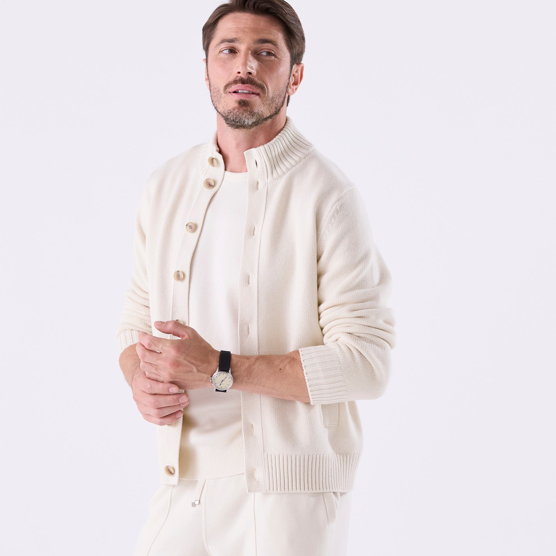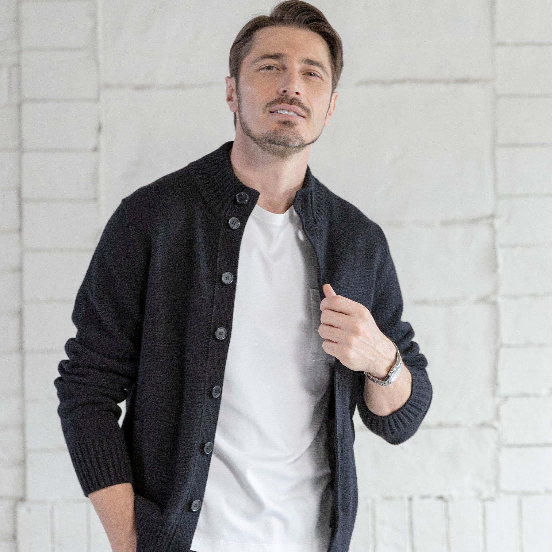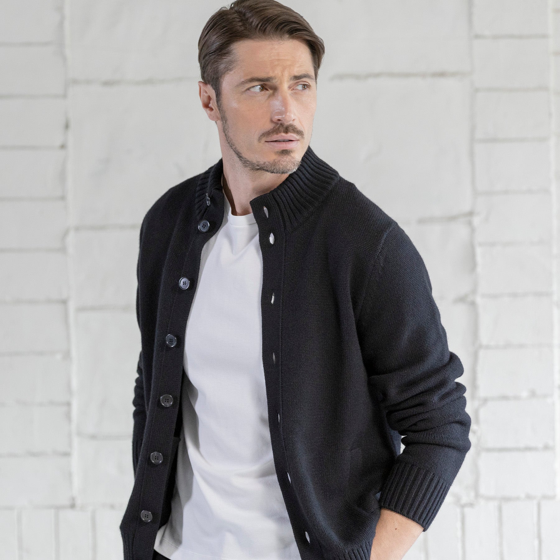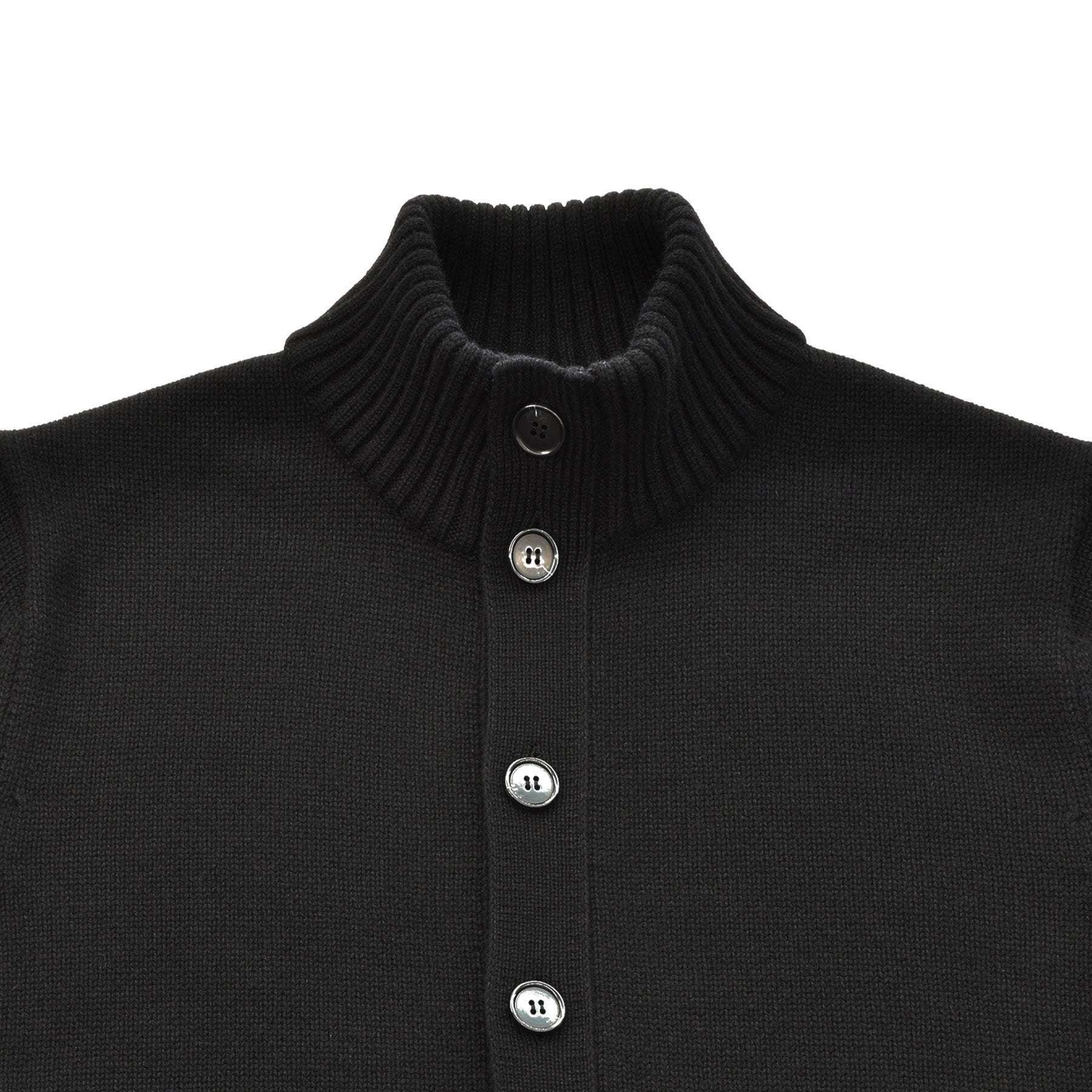 シルクカシミヤの高級素材を贅沢に使用し重厚感を感じる厚みで仕上げたスタンドネックカーディガン。シルエットが重くならないようサイズをあえてレギュラーサイズにキープしているので、秋はライトアウター冬はコートインとして着用可能です。衿や袖などのリブはボリューム感を付けてデザインのアクセントに。衿は上から2つめの釦を開けて程良く衿が開く仕様になっています。すっきりとした品の良いカジュアルがお好きな方におすすめの一枚です。