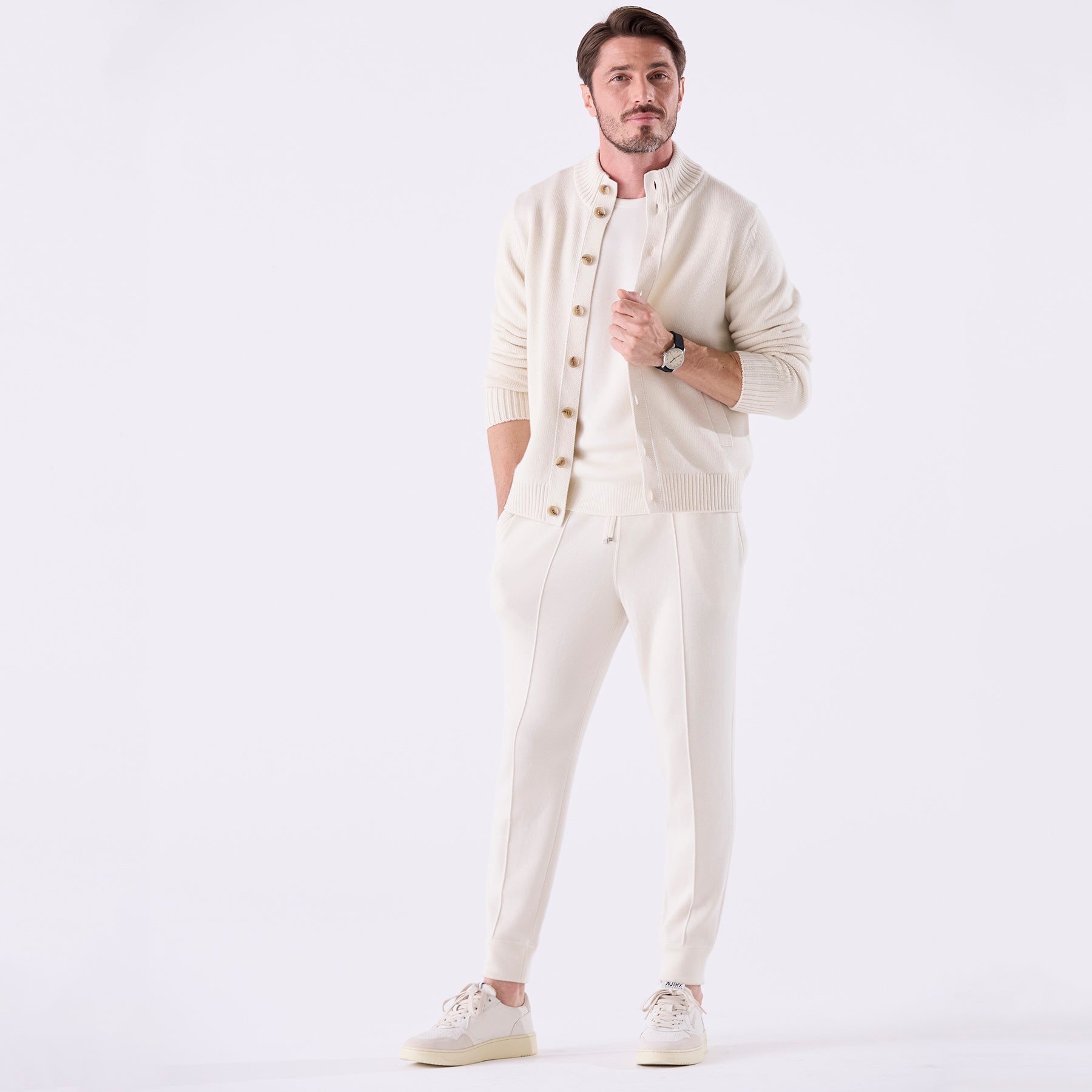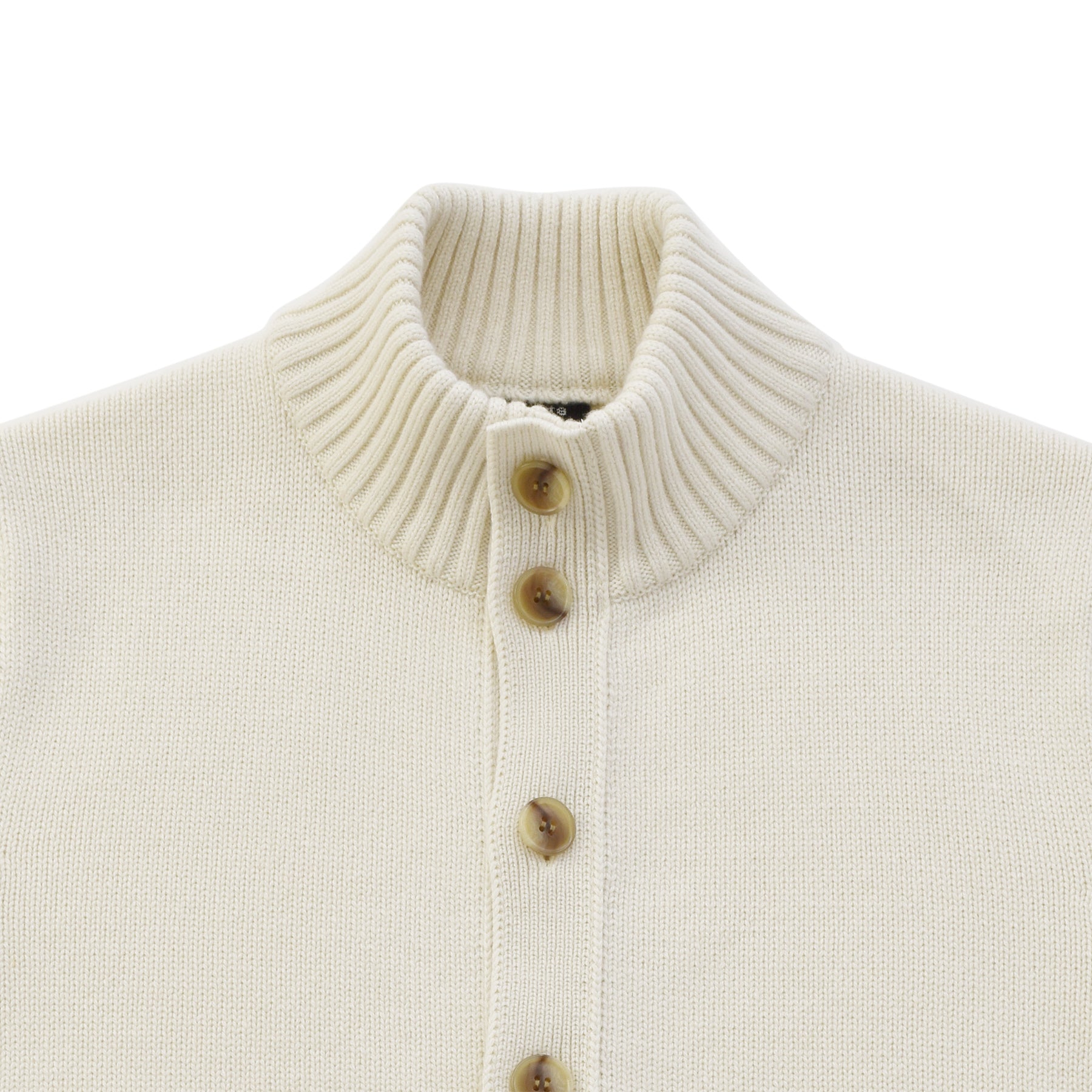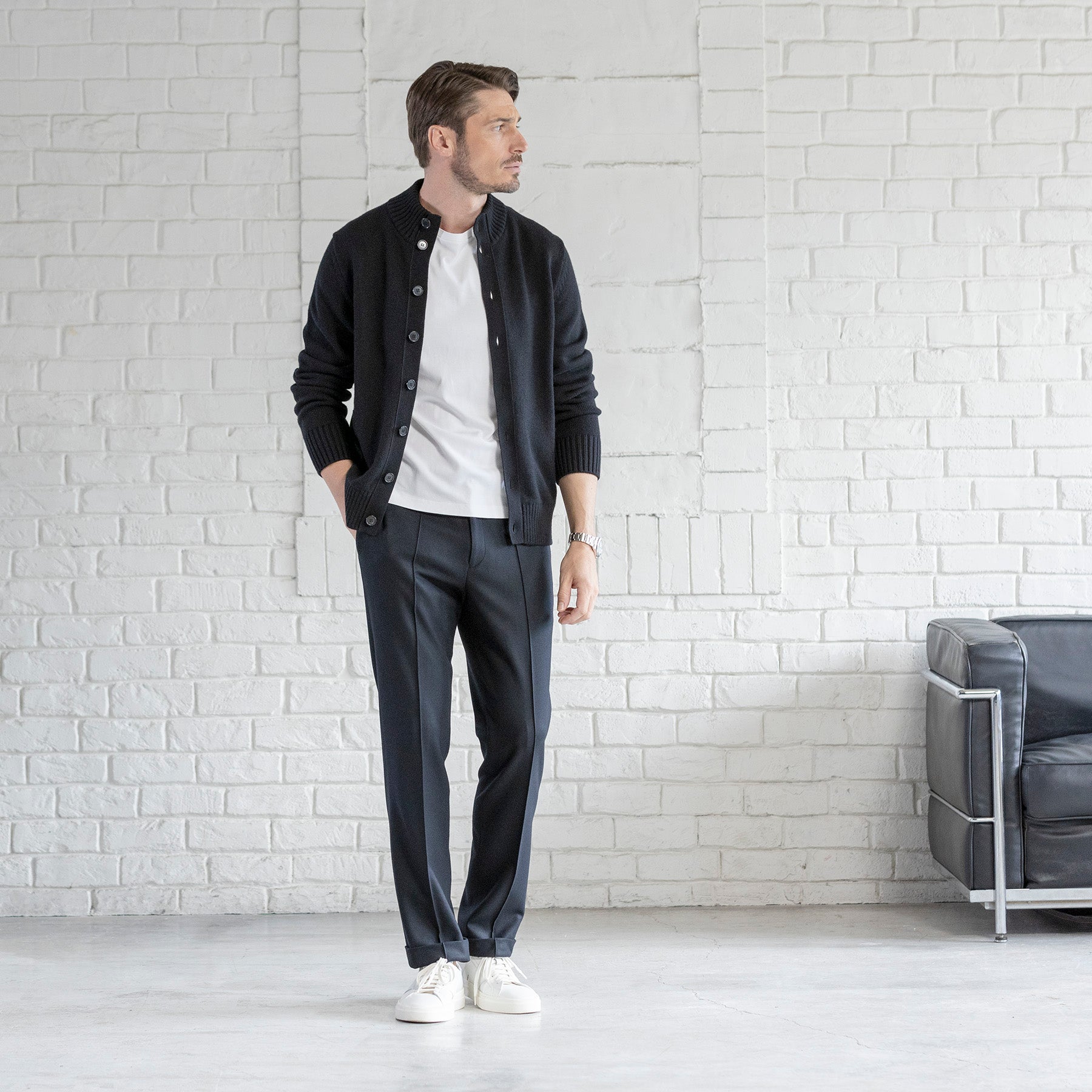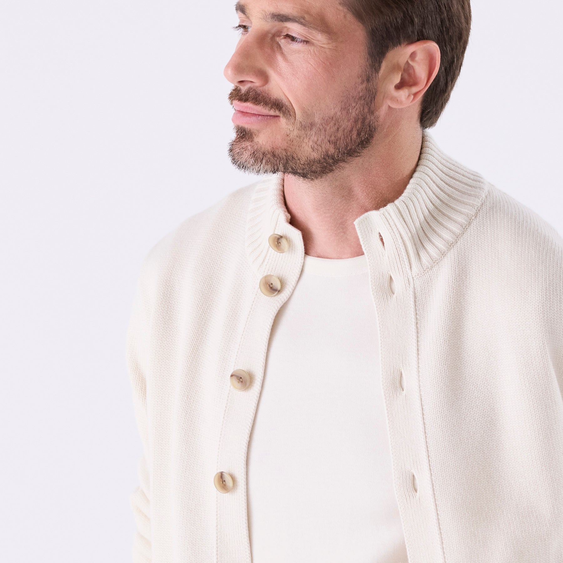 シルクカシミヤの高級素材を贅沢に使用し重厚感を感じる厚みで仕上げたスタンドネックカーディガン。シルエットが重くならないようサイズをあえてレギュラーサイズにキープしているので、秋はライトアウター冬はコートインとして着用可能です。衿や袖などのリブはボリューム感を付けてデザインのアクセントに。衿は上から2つめの釦を開けて程良く衿が開く仕様になっています。すっきりとした品の良いカジュアルがお好きな方におすすめの一枚です。